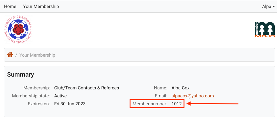 - Alternatively, each member can find their own number on the NEHYL Contacts System on each individual's dashboard summary (see screenshot below) and send it to the person completing the form.