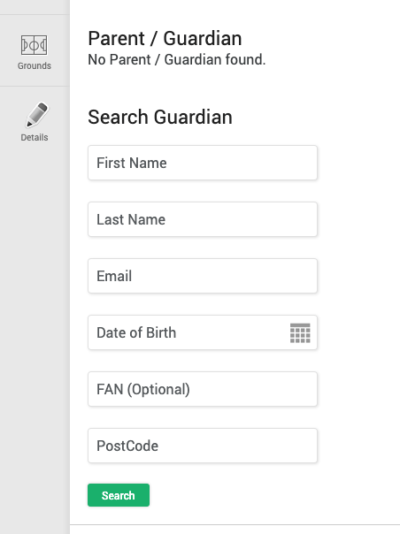 For club/team officials to attach a parent, the details required (for the parent) are shown in the screenshot below - a FAN is generated if none exists based on the search criteria shown. The FA have now created a new feature to add a parents email address to a player which sends them an email to confirm the player and attach the record. This avoids the need to request a parent's DOB. Click the link below for further details.