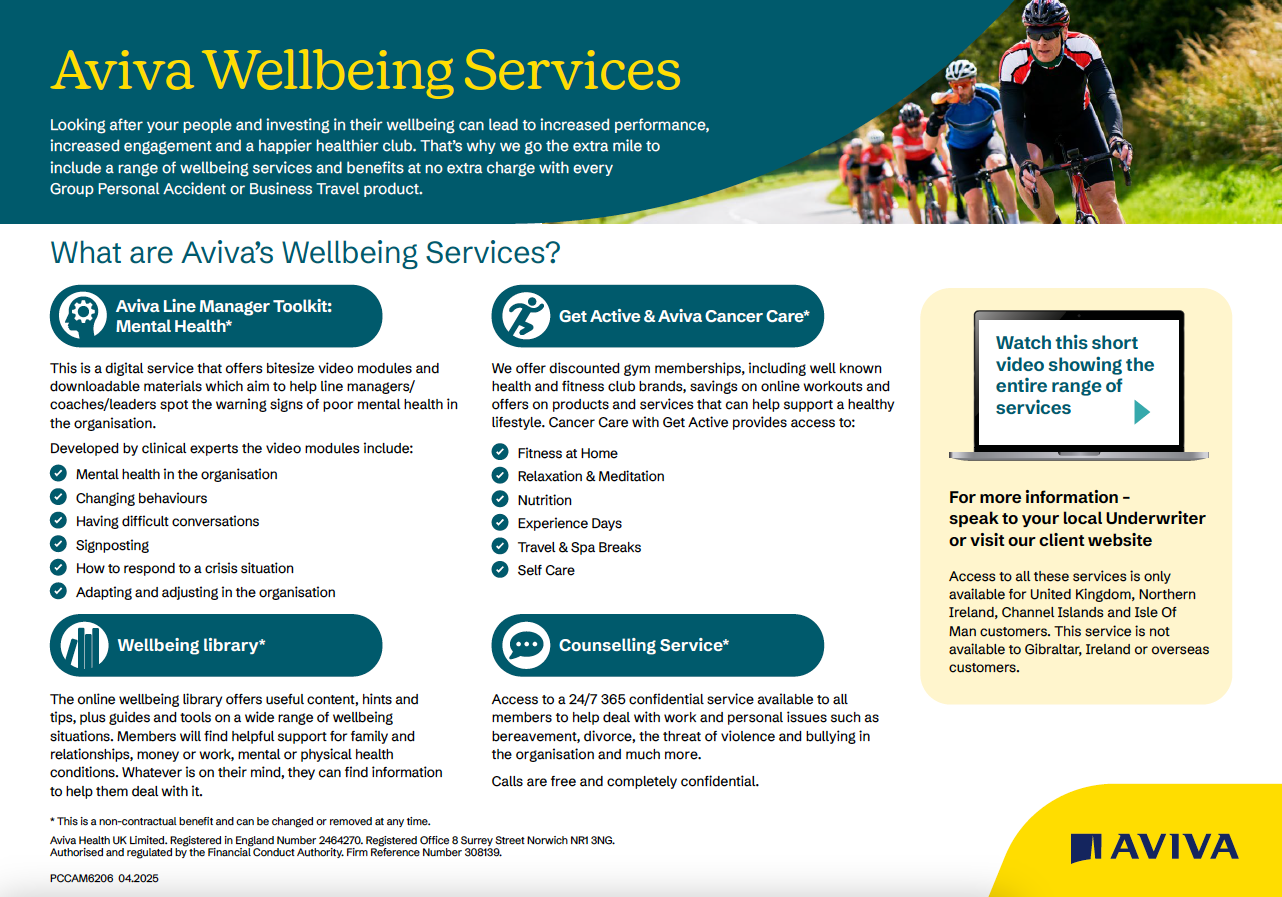 Hampshire FA have provided the below leaflet. All levels of the personal accident insurance include the wellbeing service and the leaflet gives details of the Aviva new fully enhanced wellbeing proposition which includes physical, financial and mental wellbeing add-ons such as gym discounts, dedicated counselling line and leaders’ mental health training.